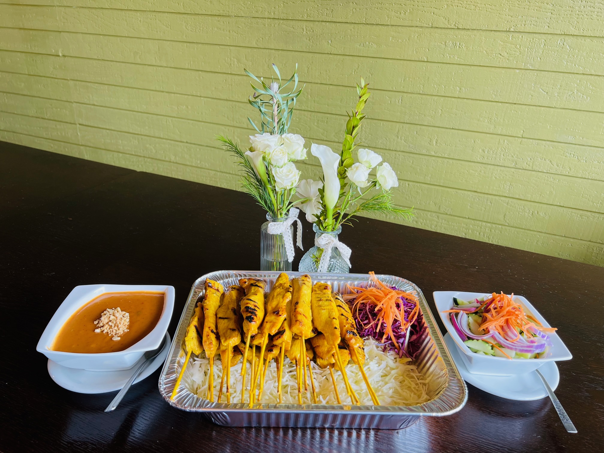 Marinated chicken on a skewer served with peanut sauce and cucumber salad