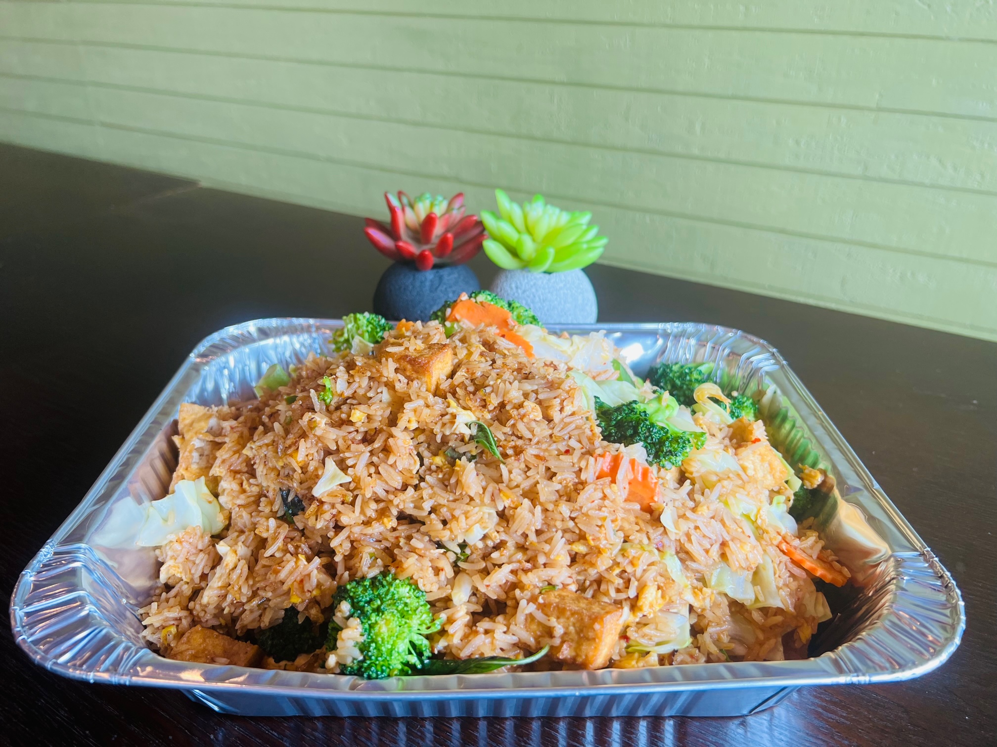 Fried rice with egg, fresh basil, onions, and bell peppers