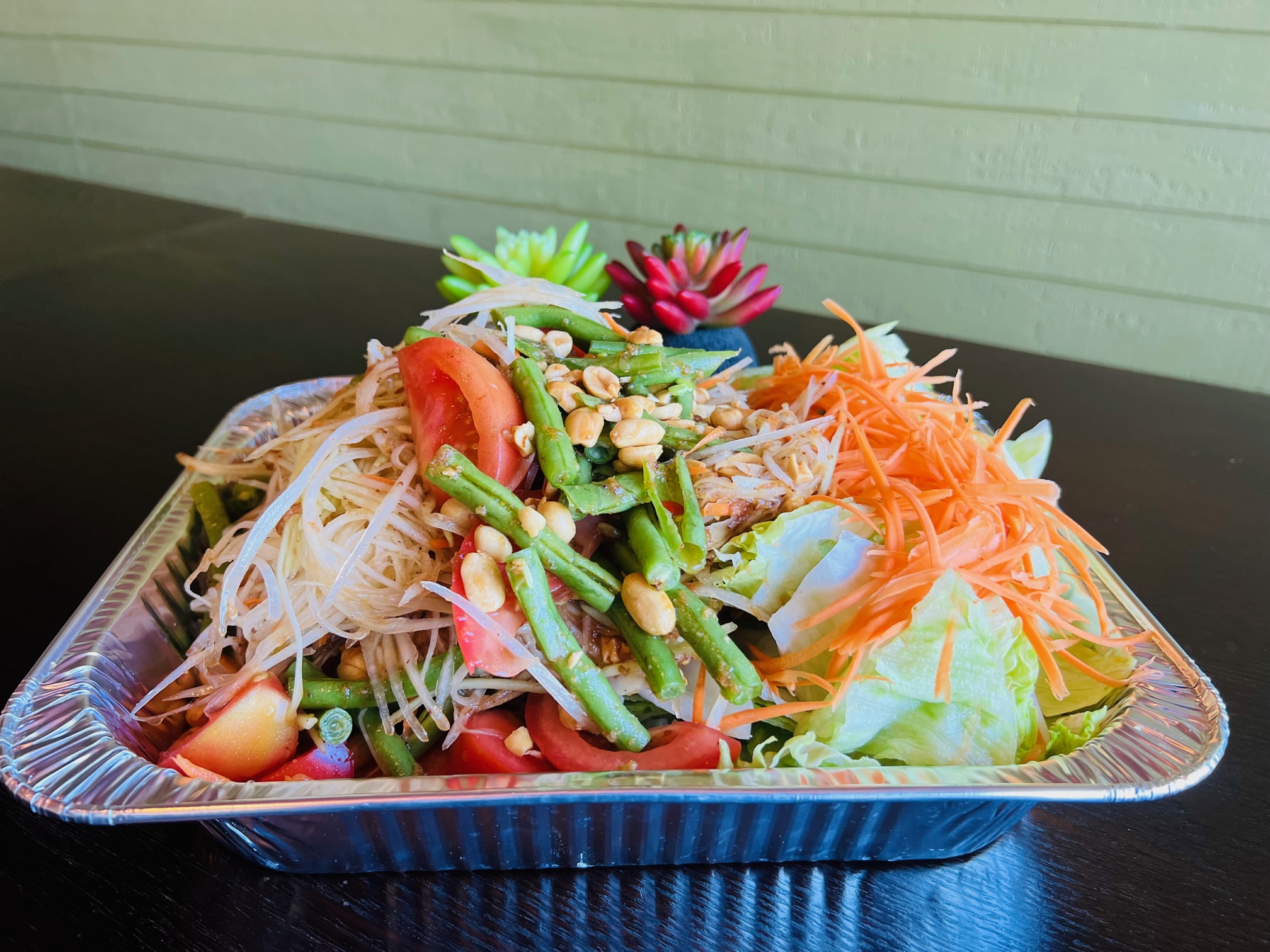 Shredded papaya, carrot, green beans, tomatoes, roasted nuts with homemade dressing