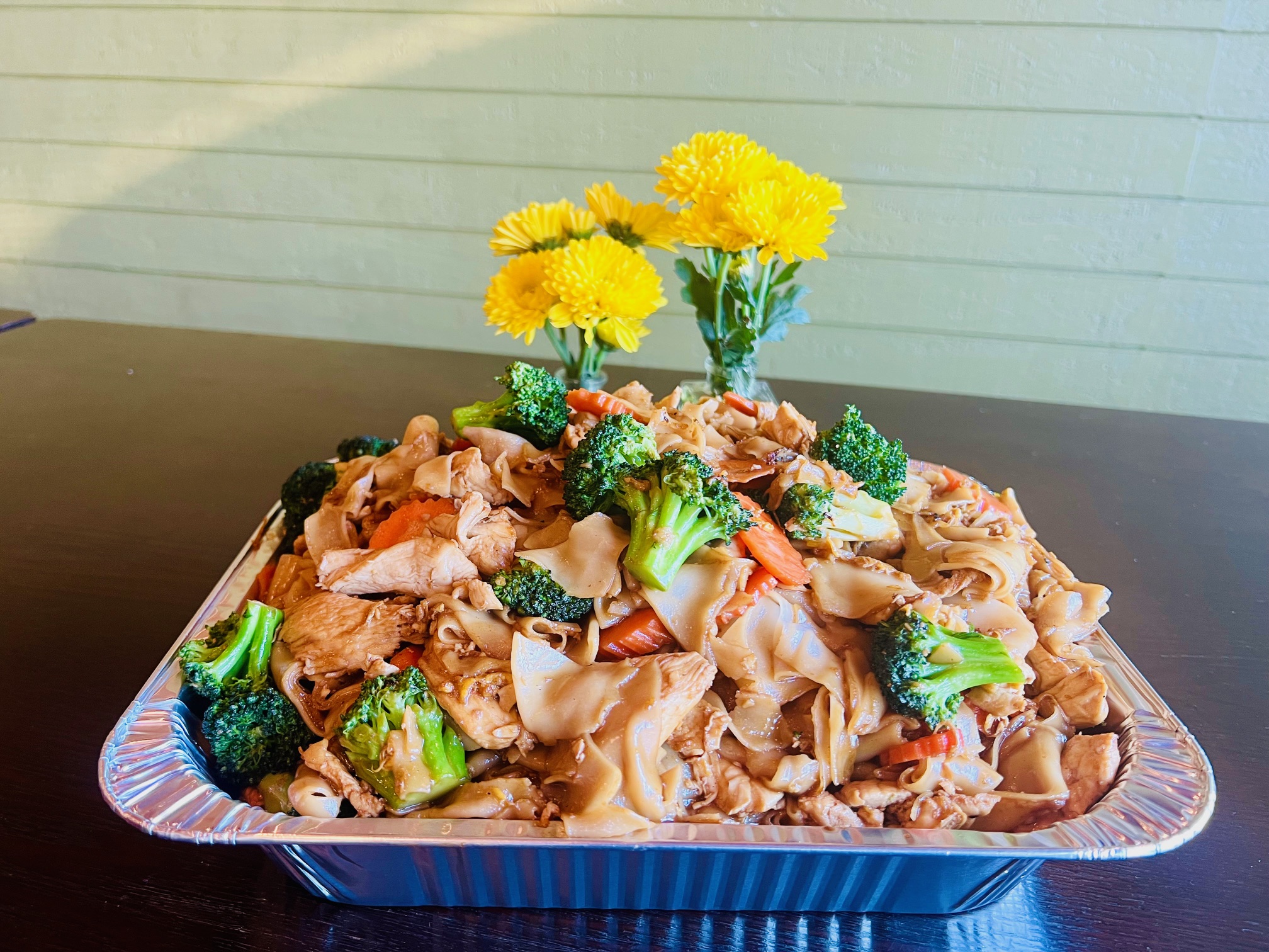 Stir fried wide rice noodles with egg, broccoli, and carrots