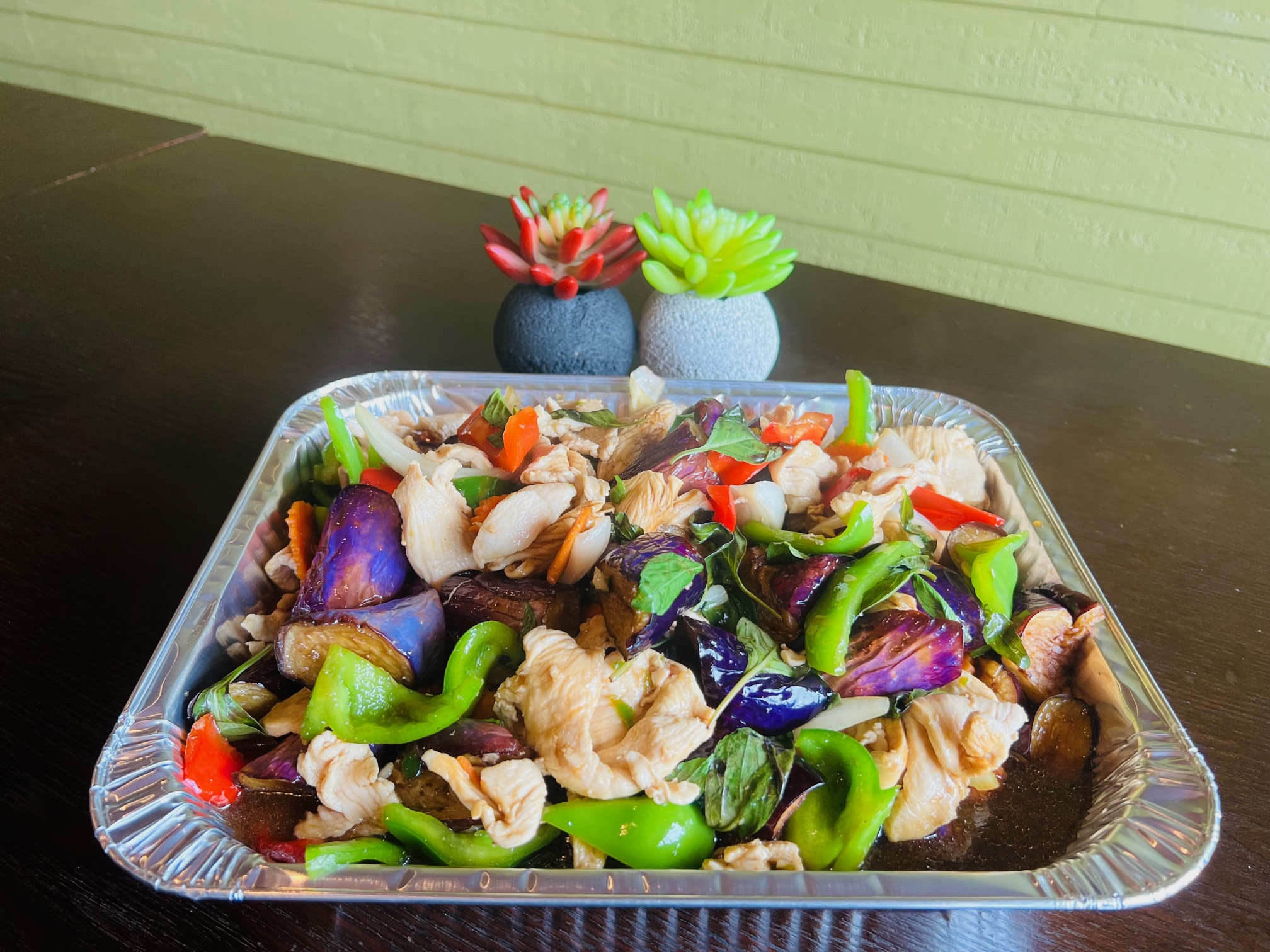 Stir fried with bamboo shoot, onions, green beans, bell peppers, and basil