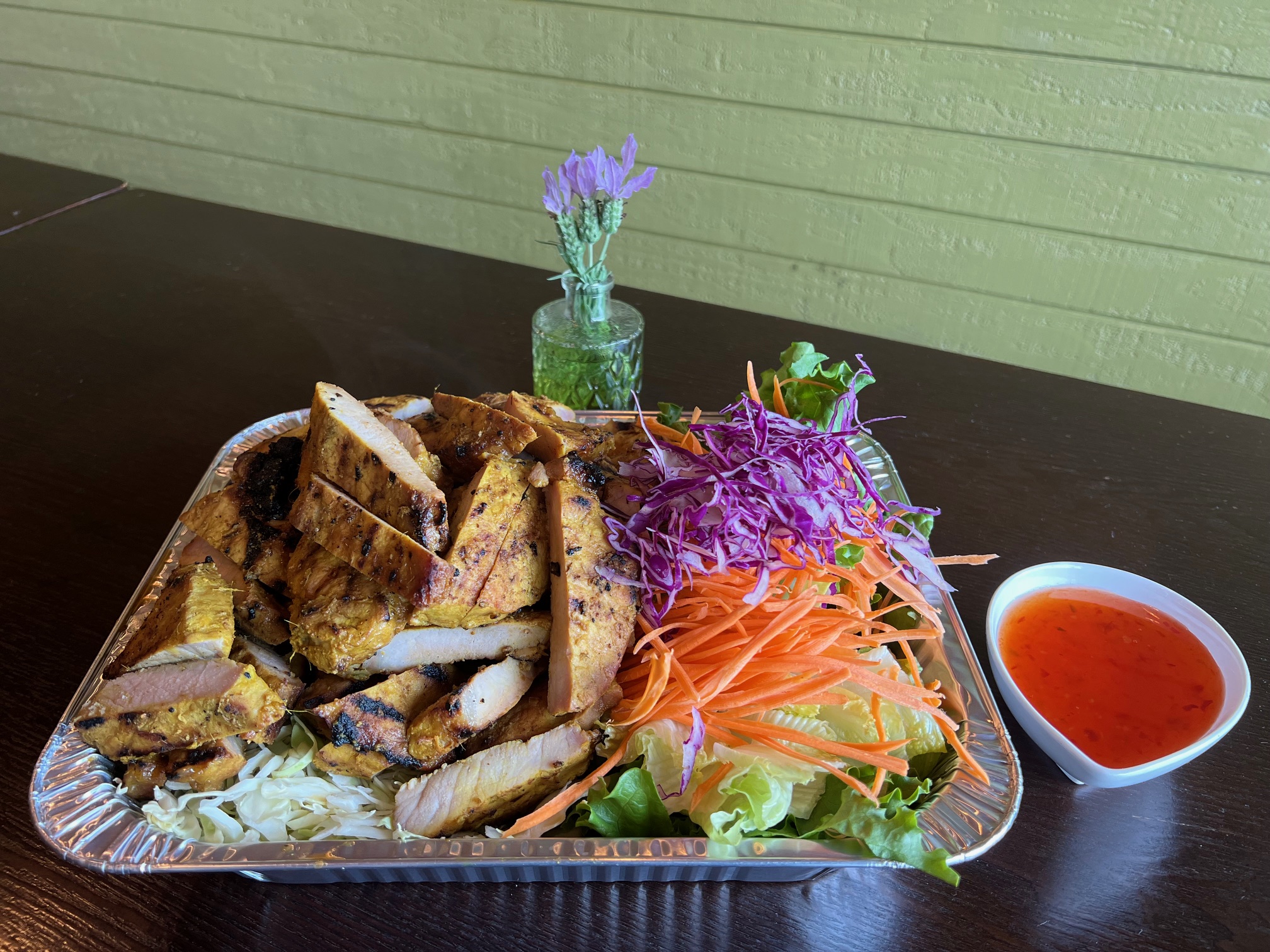 Grilled marinated chicken (Thight) with Thai herbs served with sweet and sour sauce