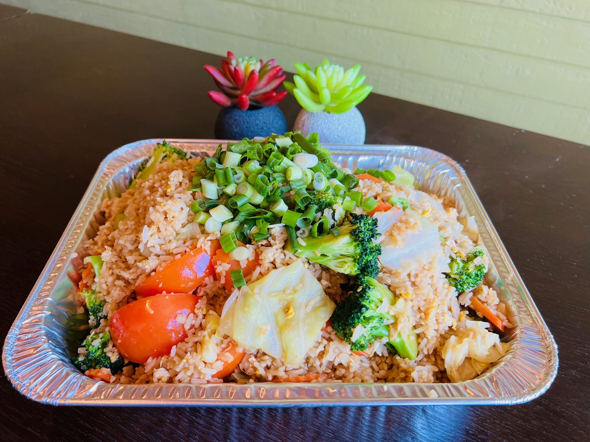 Stir fried with bell peppers, carrots, onions, and basil