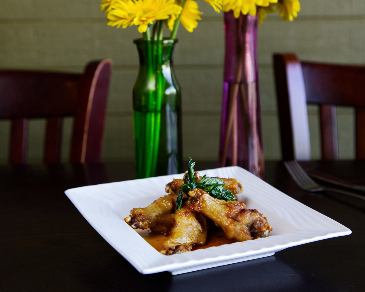 Fried chicken wings and glazed with our sweet and spicy sauce with crispy basil