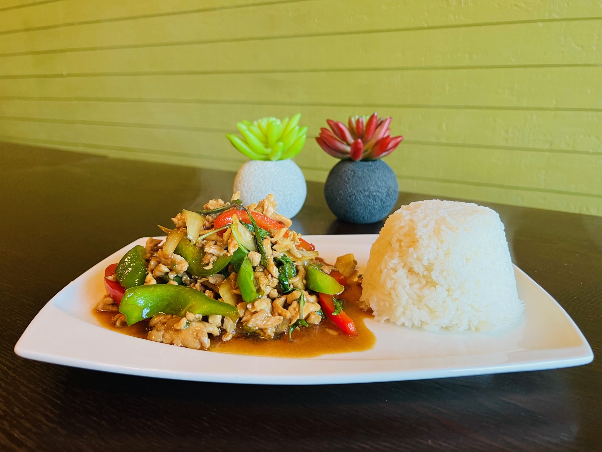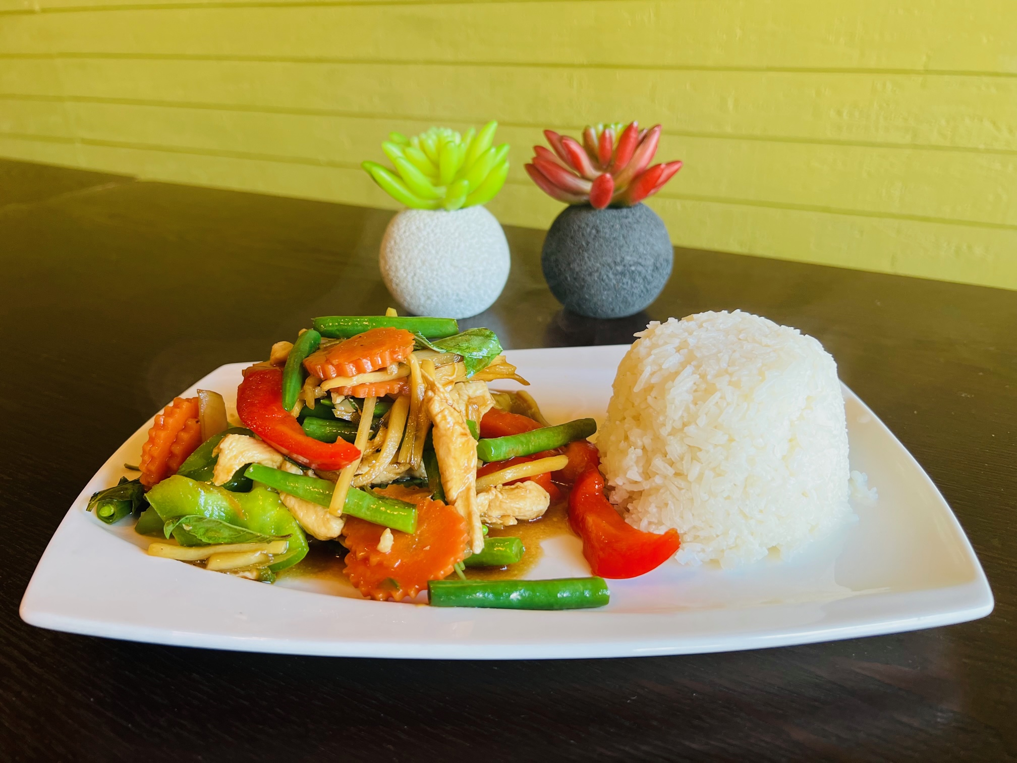 Stir fried with bamboo shoot, onions, green beans, bell peppers, and basil