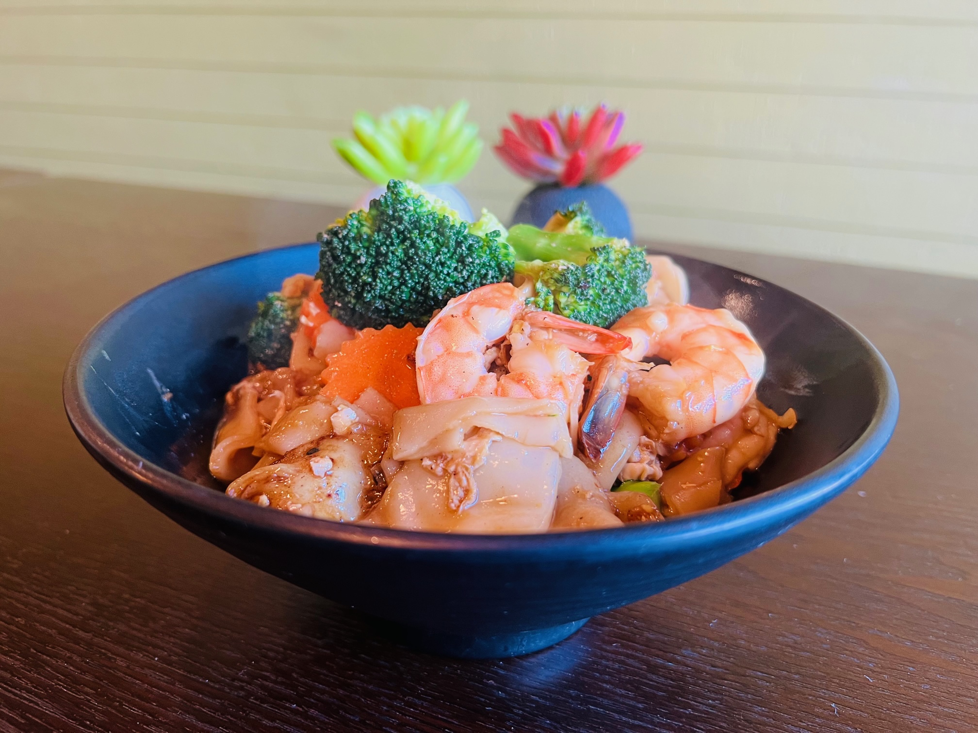 Stir fried wide rice noodles with egg, basil, chili, carrots, bell peppers, and cabbage