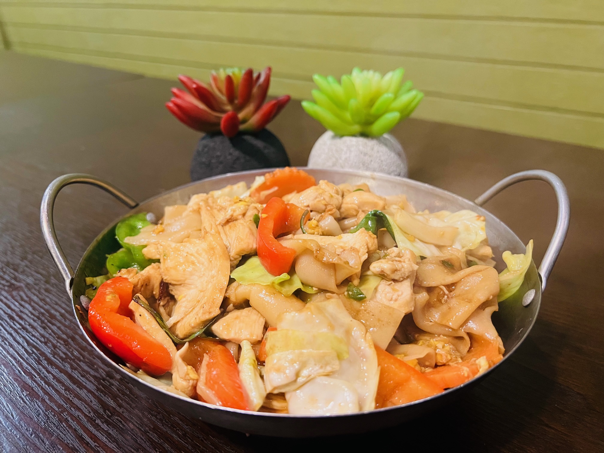 Stir fried wide rice noodles with egg, basil, chili, carrots, bell peppers, and cabbage