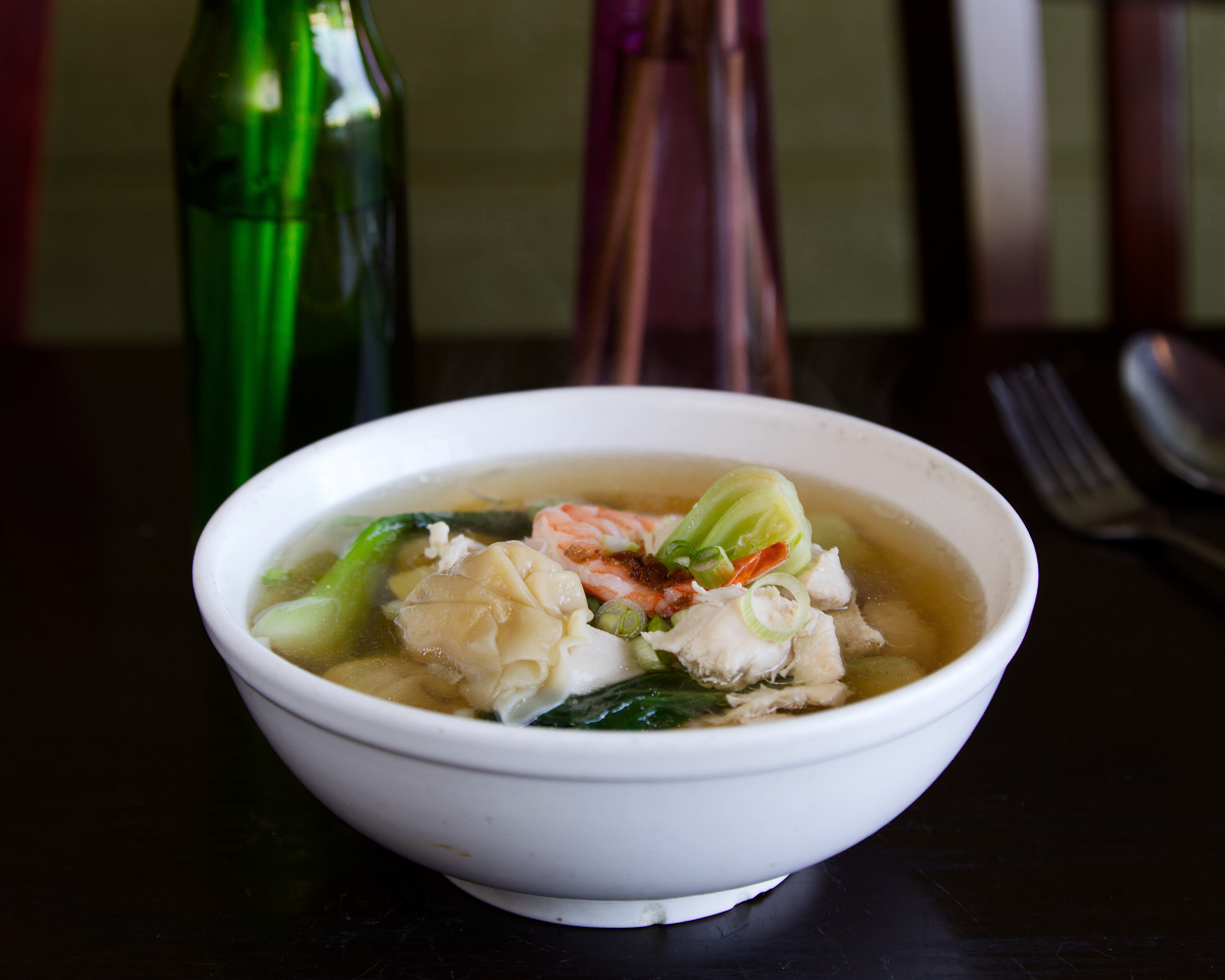 Seasoned wontons with chicken, shrimps, and bok choy in chicken broth with green onions