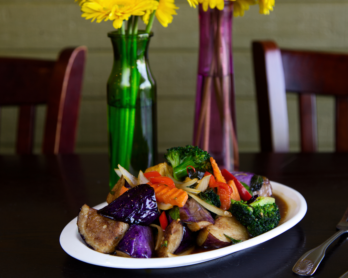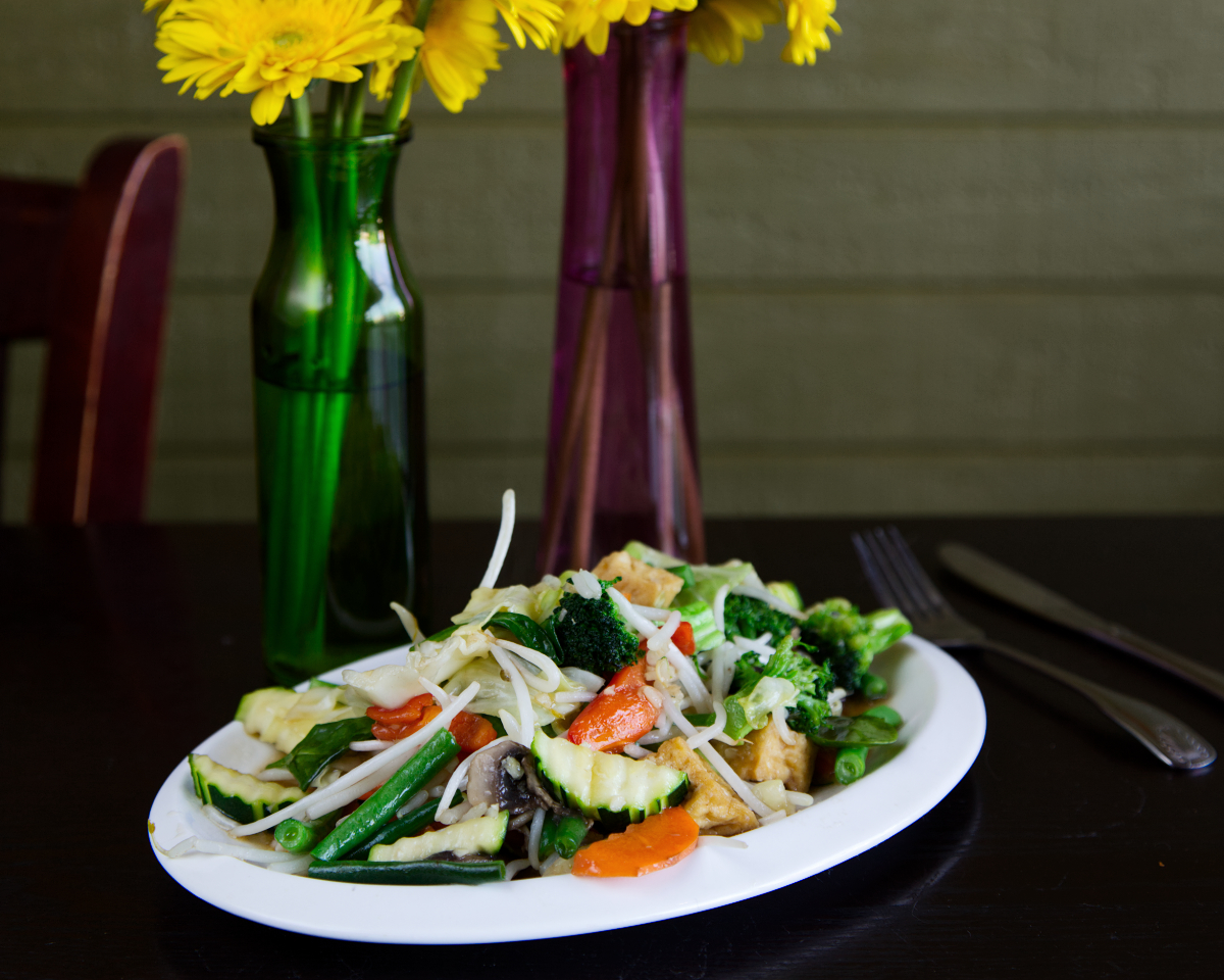 Stir fried with broccoli, zucchini, spinach, bok choy and green beans