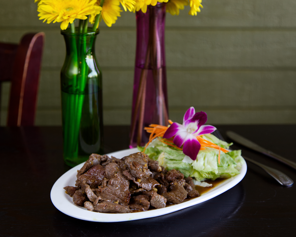 Grilled beef with red and green onions, carrots, cilantro, and roasted rice powder