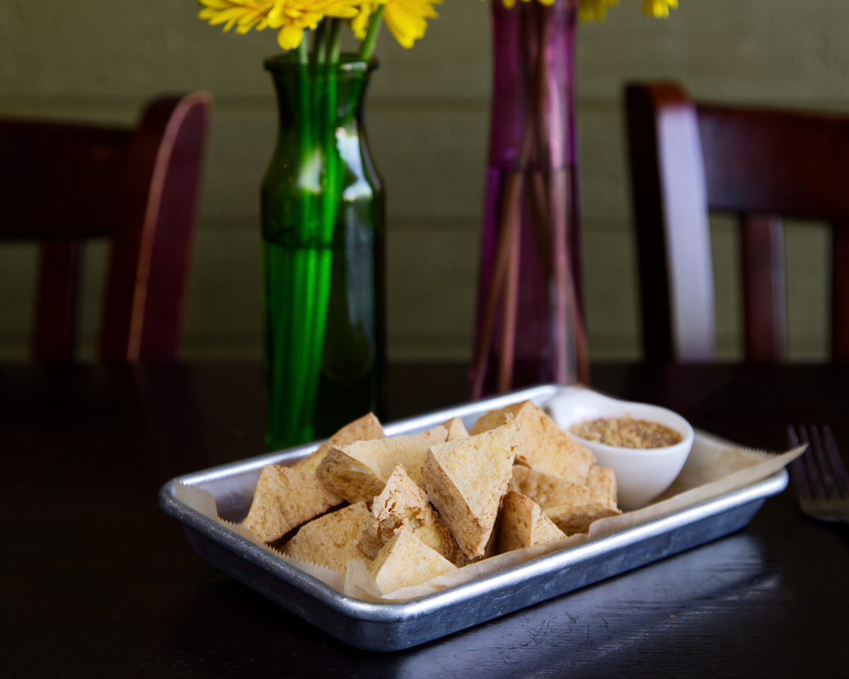 Deep-fried tofu served with sweet and sour dipping sauce with crushed peanuts