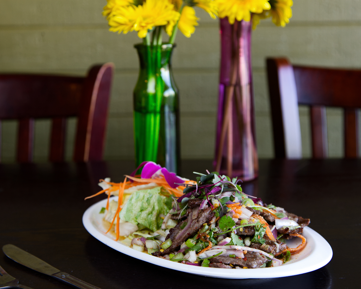 Shredded papaya, carrot, green beans, tomatoes, roasted nuts with homemade dressing