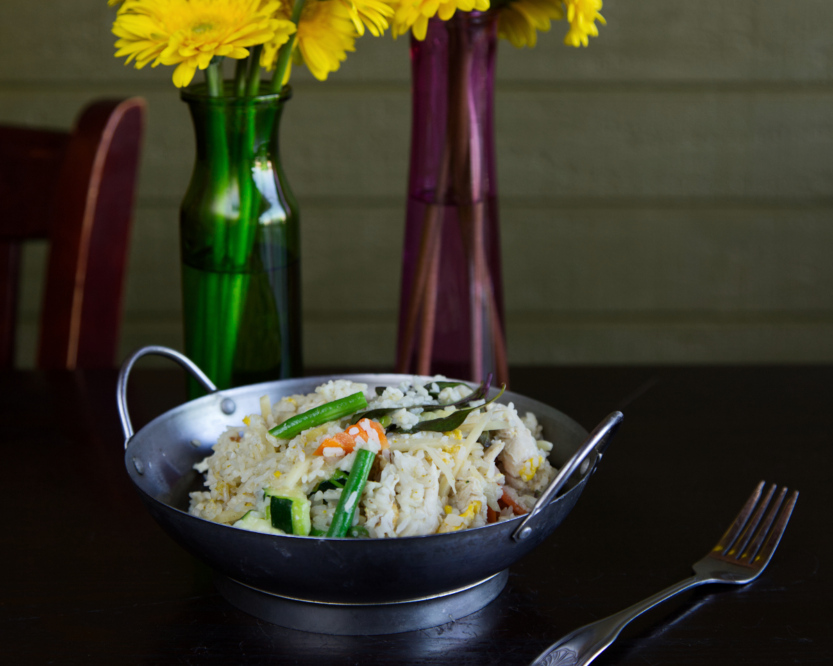 Fried rice with egg, bamboo shoots, green beans, zucchini, bell peppers, carrots, and basil.