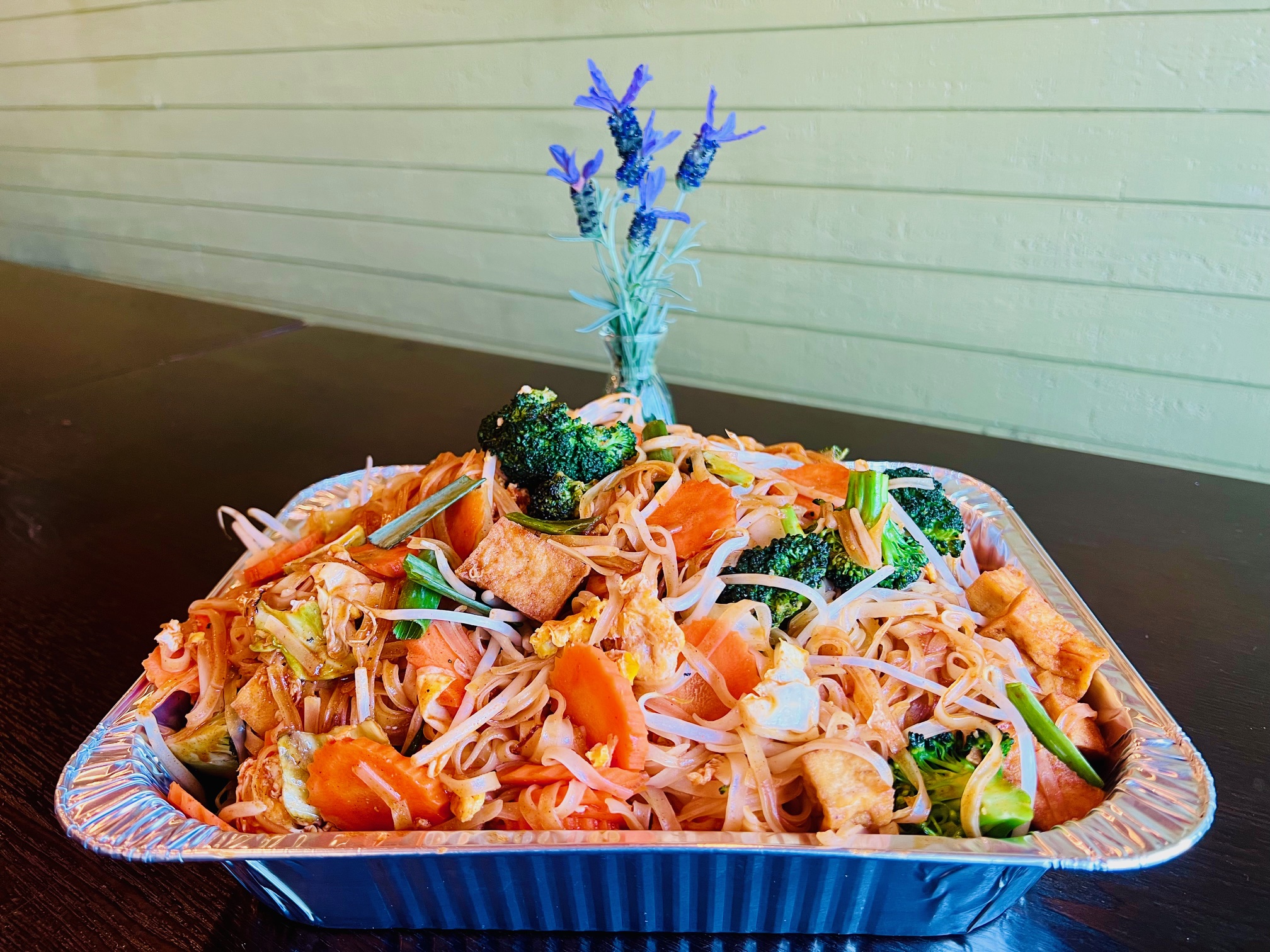 Stir fried wide rice noodles with egg, basil, chili, carrots, bell peppers, and cabbage