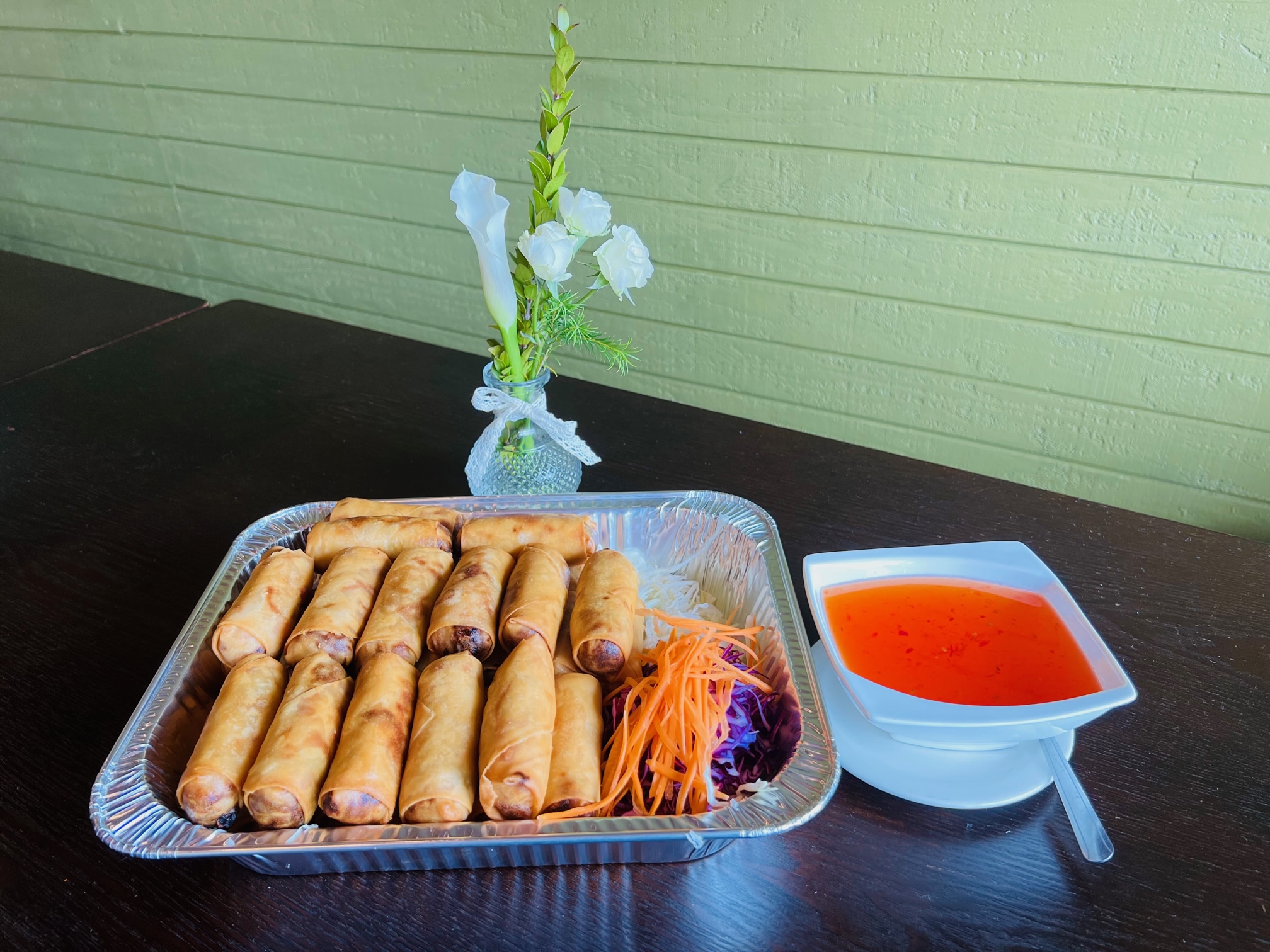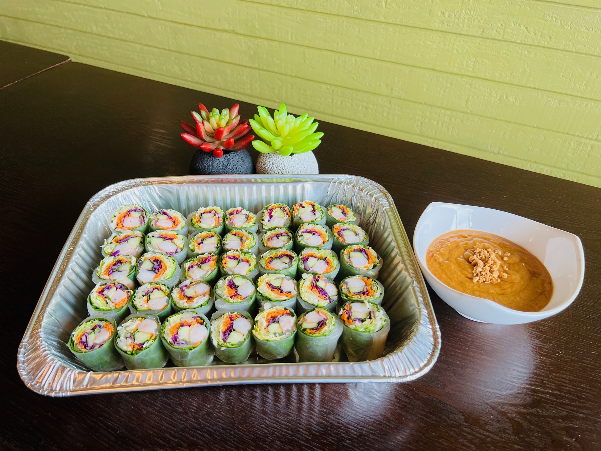 Rice paper wrapped with basil, carrots, cabbage, lettuce, and cucumber served with sweet sauce or peanut sauce