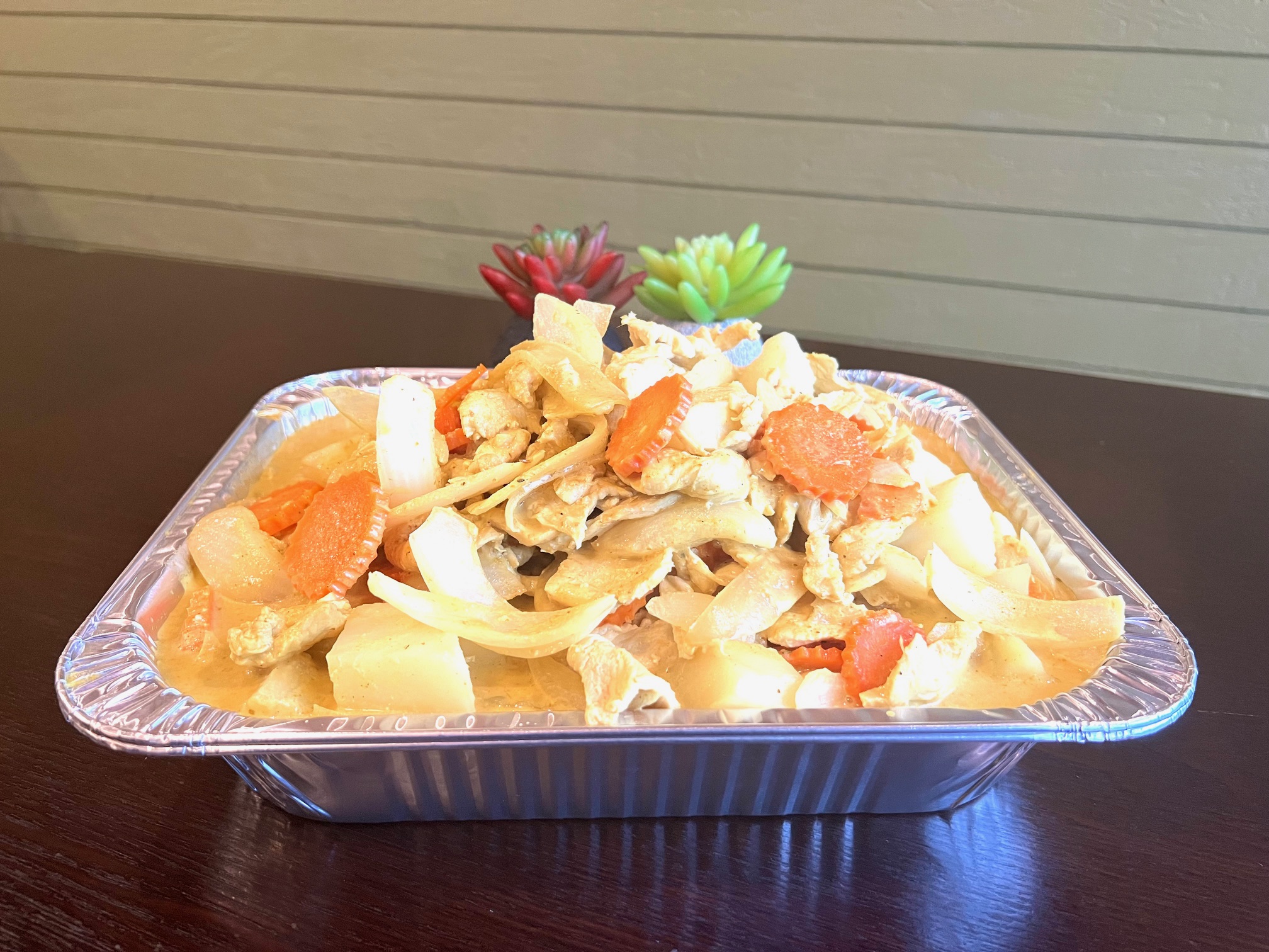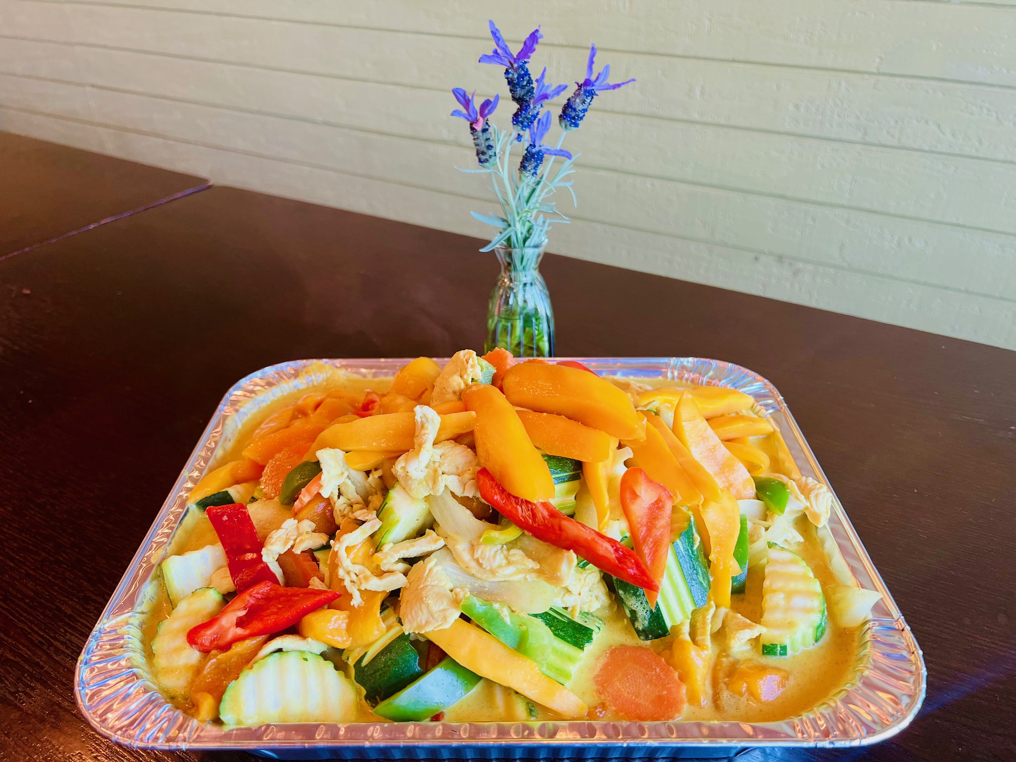 Fresh mangoes simmered in yellow curry base, brightened with zucchini, bell peppers onions and carrots