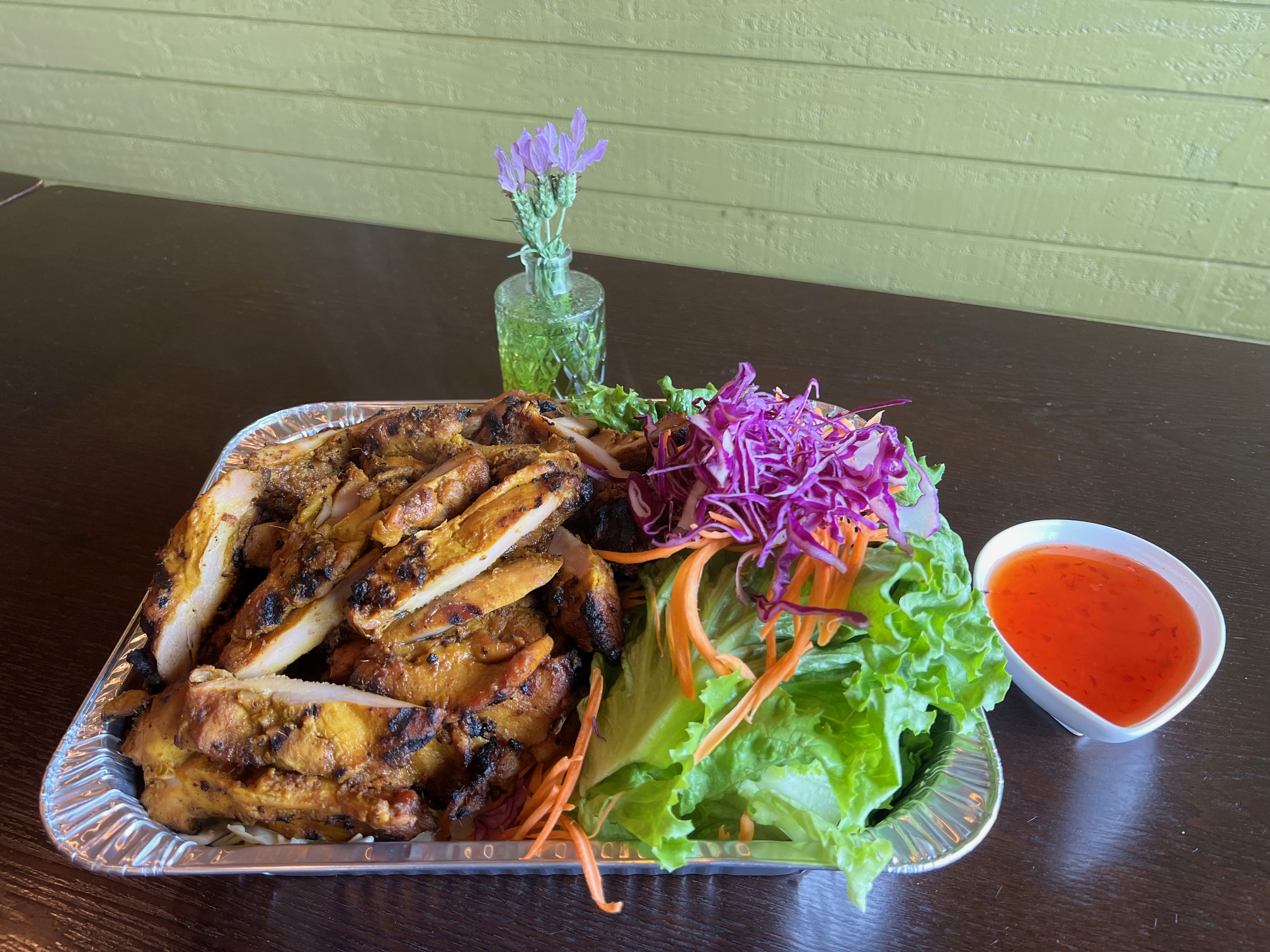 Grilled marinated chicken (Thight) with Thai herbs served with sweet and sour sauce