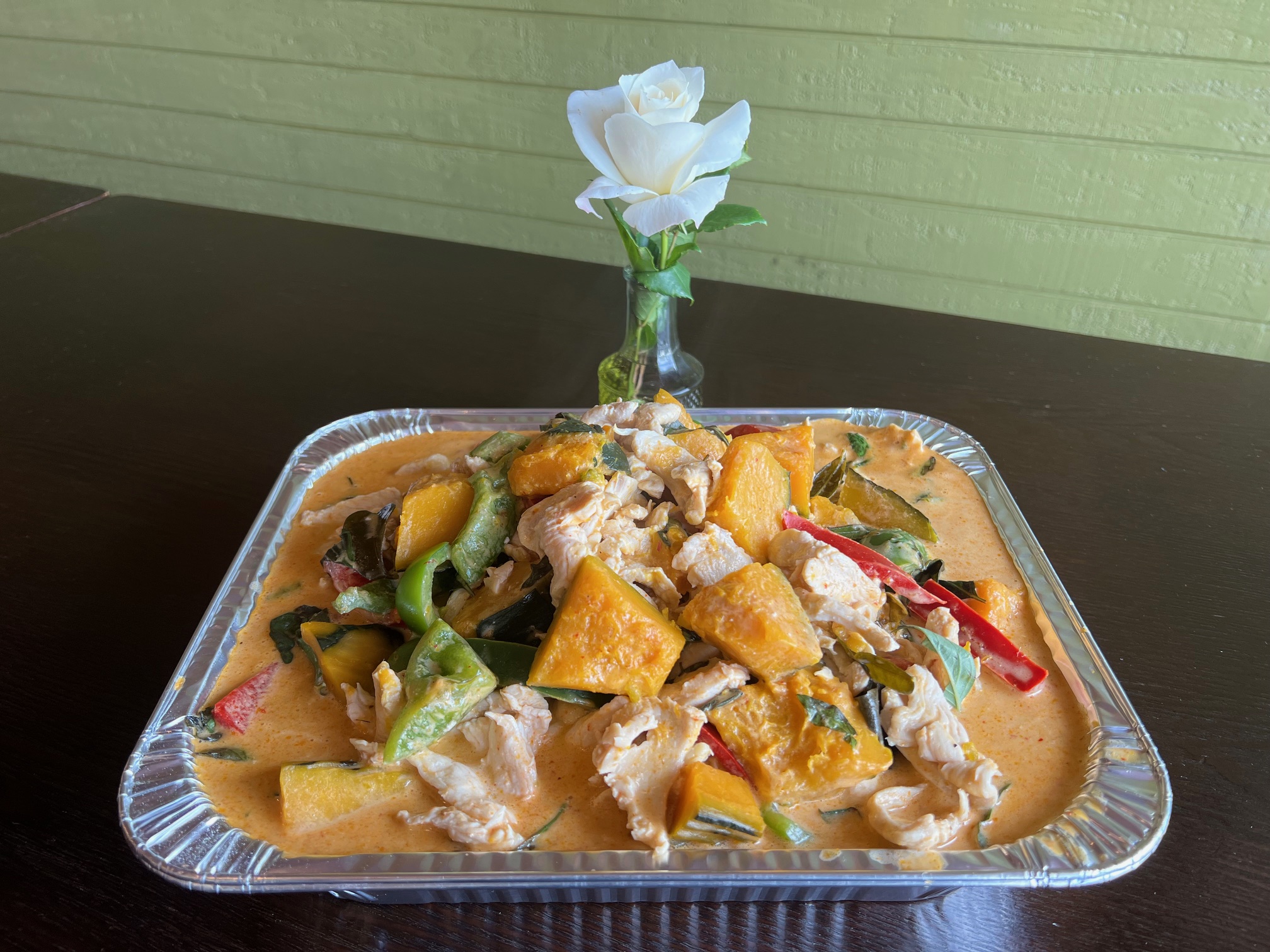 Red curry paste, kabocha pumpkin, bell peppers and basil