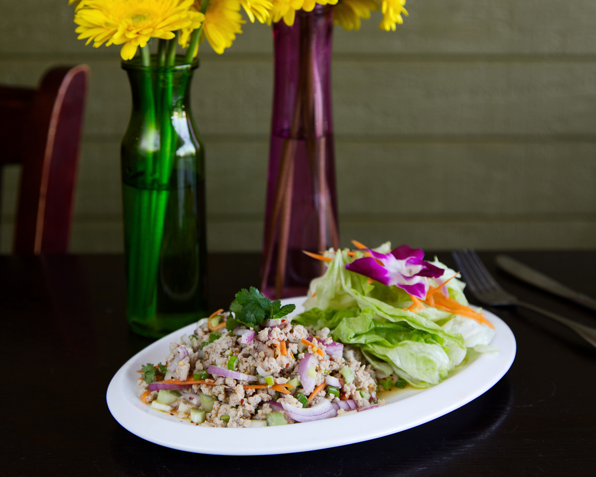 Ground chicken with cilantro, green onions, carrots, red onions, and roasted rice powder