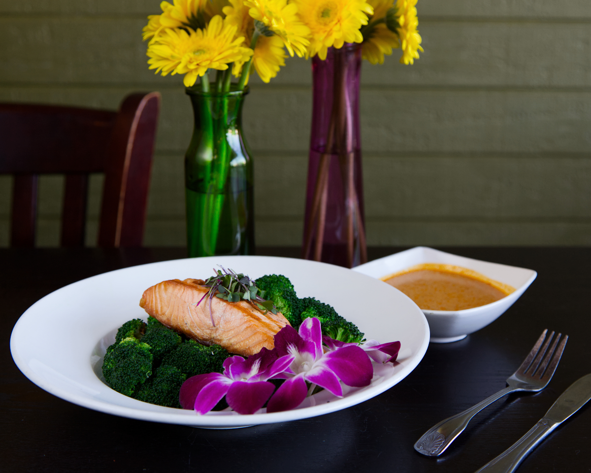 Grilled salmon with broccoli, bell peppers, carrots and basil
