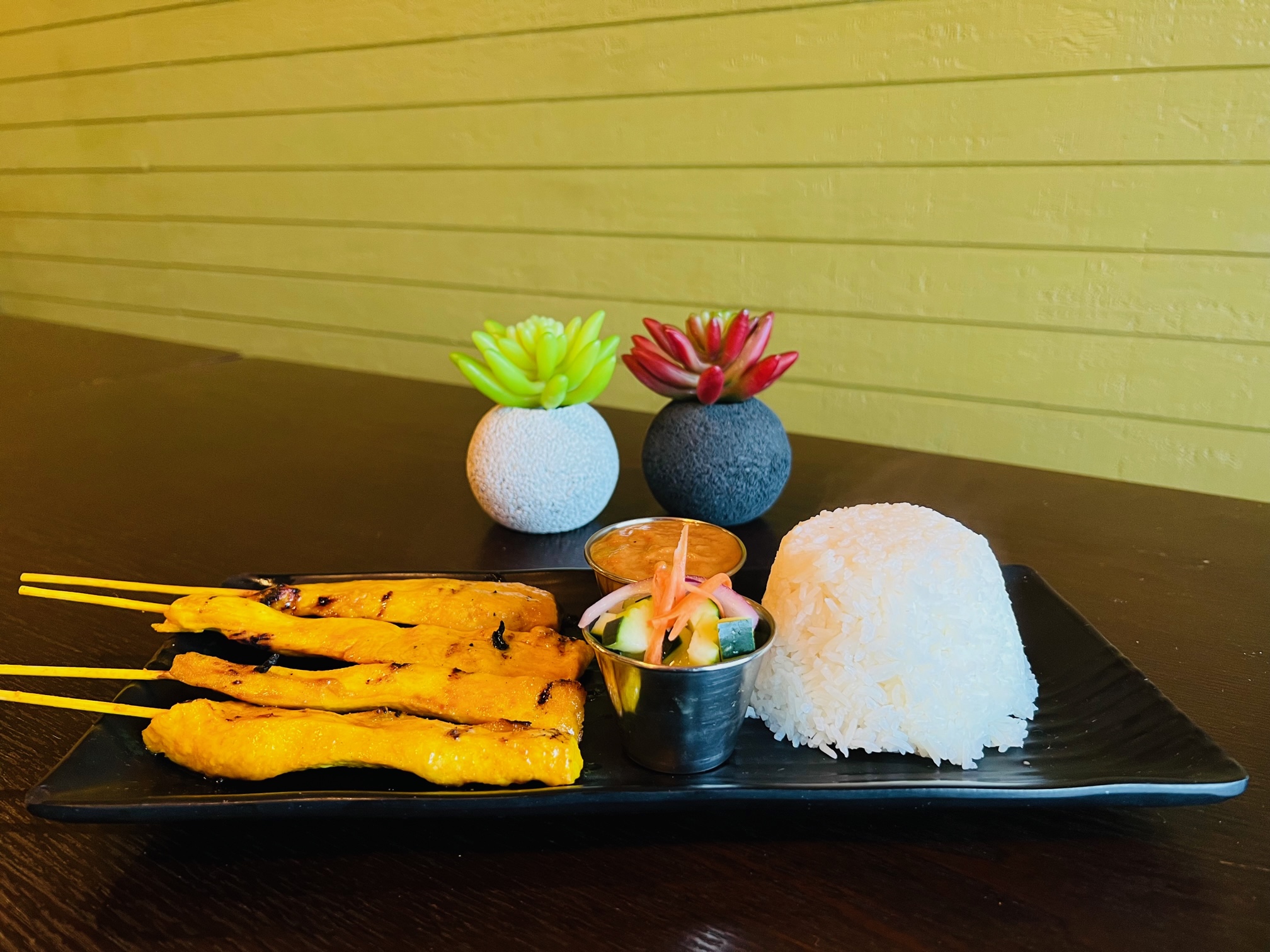 Marinated chicken on a skewer served with peanut sauce and cucumber salad