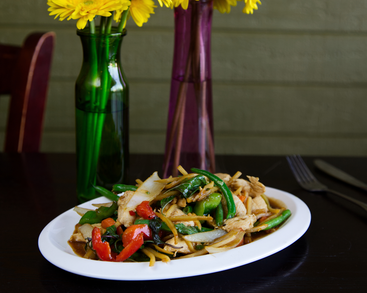 Stir fried with bamboo shoot, onions, green beans, bell peppers, and basil