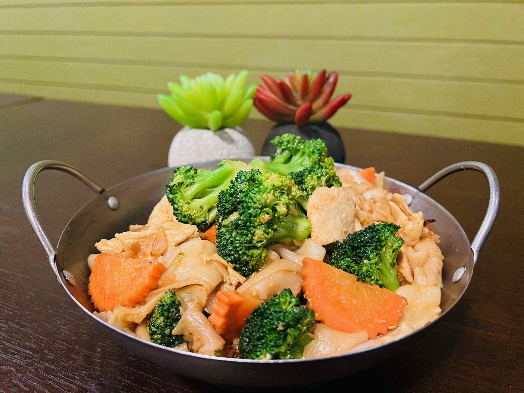 Stir fried wide rice noodles with egg broccoli, and carrots