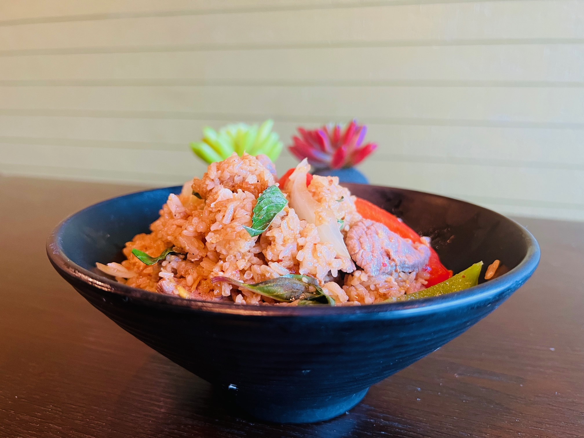 Fried rice with fresh basil, onions, bell pepper, and egg