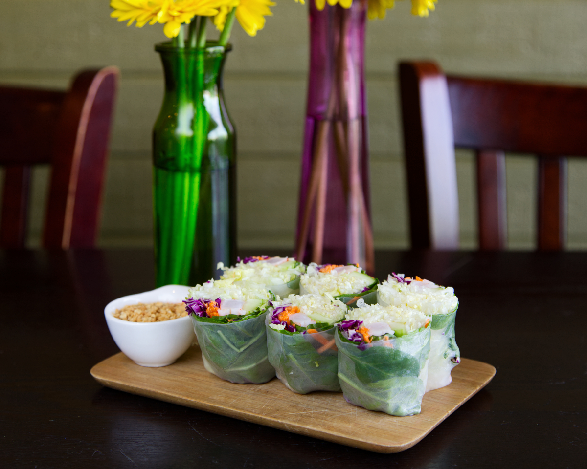 Rice paper wrapped with basil, carrots, cabbage, lettuce, and cucumber served with sweet sauce or peanut sauce