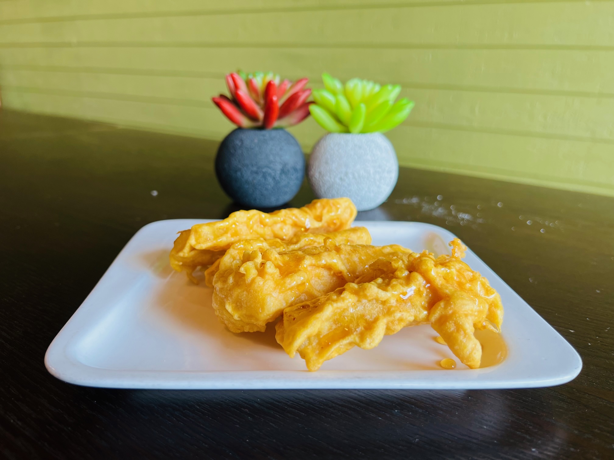 Fried shrimps wrapped with egg rolls skins served with sweet sauce