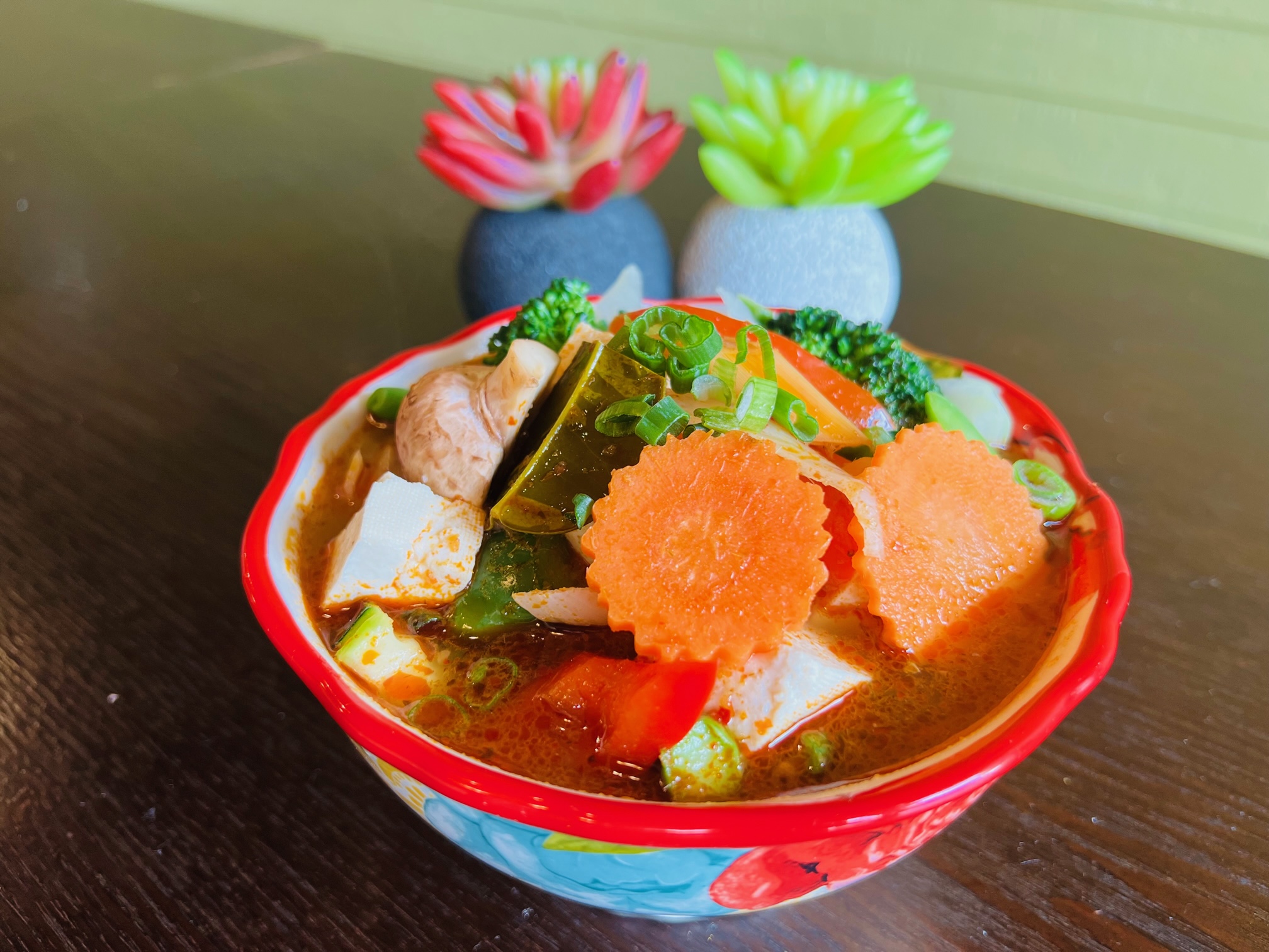 Fresh mangoes simmered in yellow curry base, brightened with zucchini, bell peppers onions and carrots