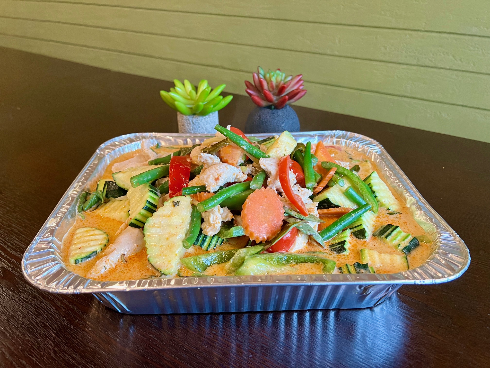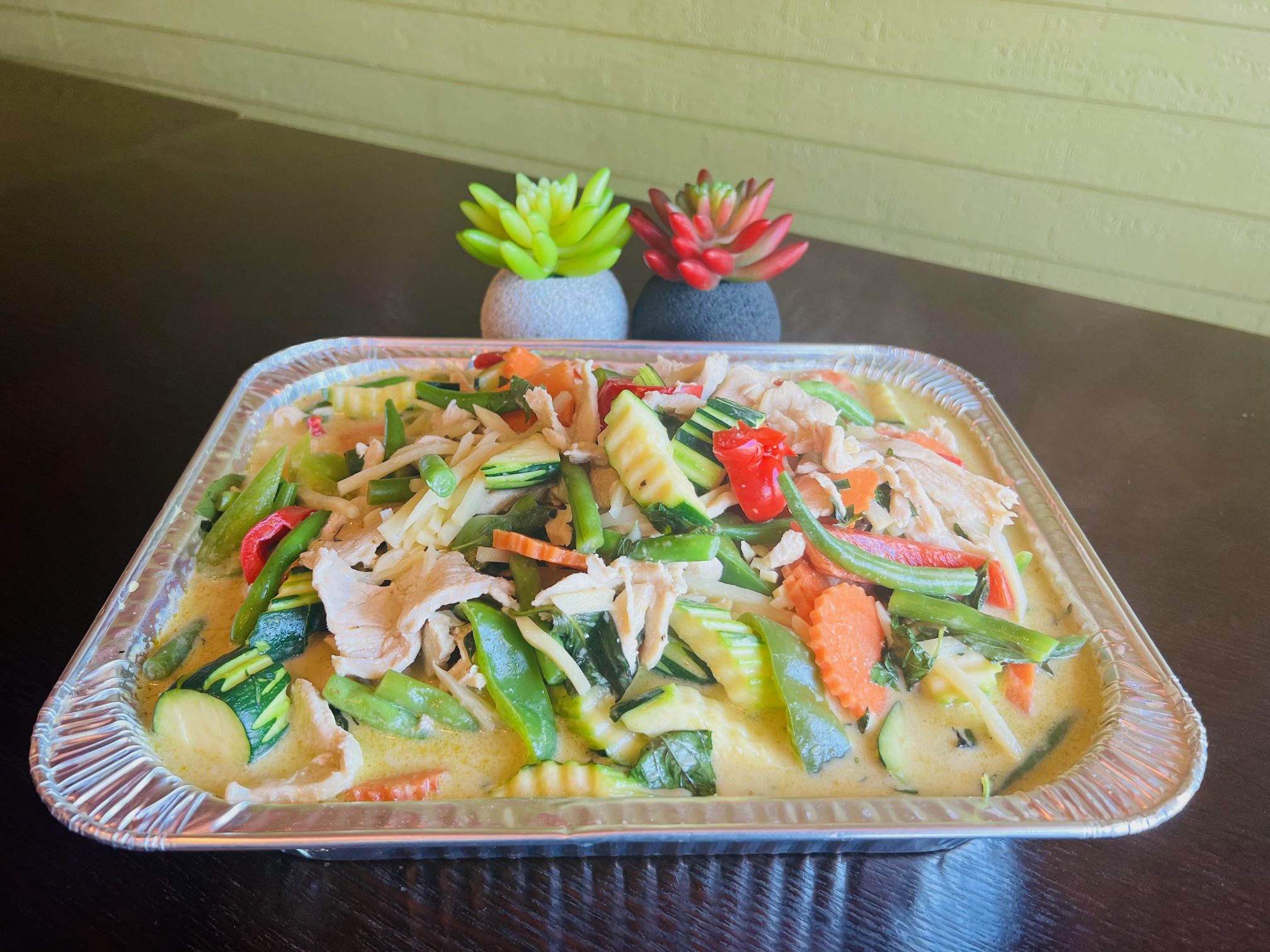 Fresh mangoes simmered in yellow curry base, brightened with zucchini, bell peppers onions and carrots