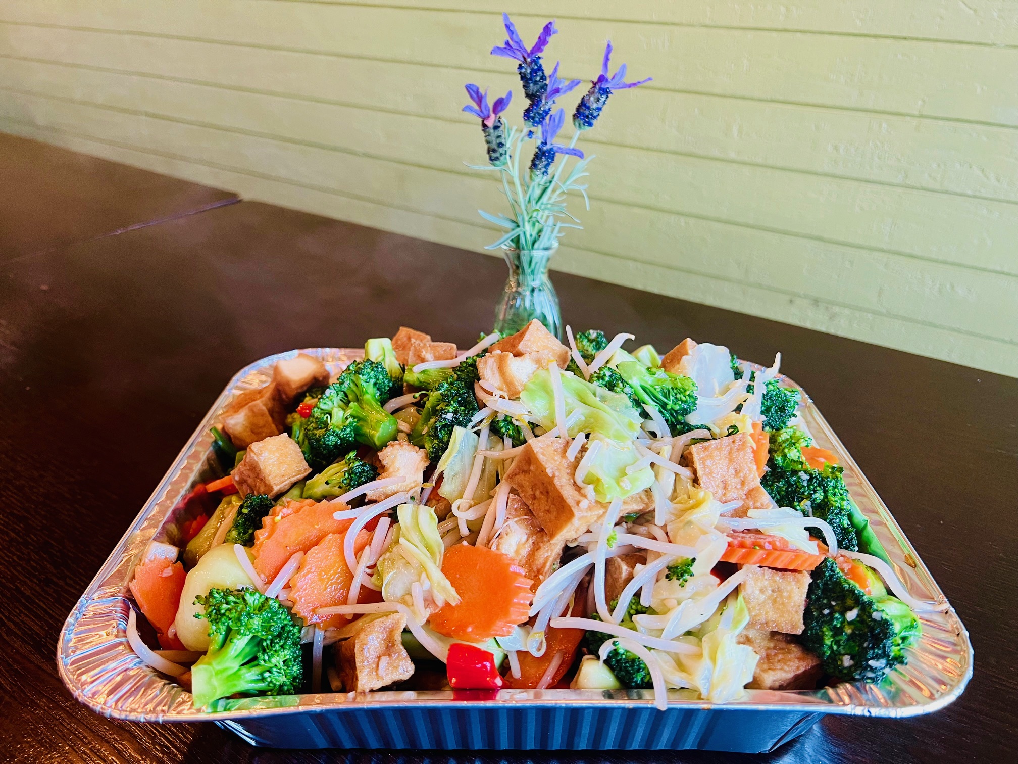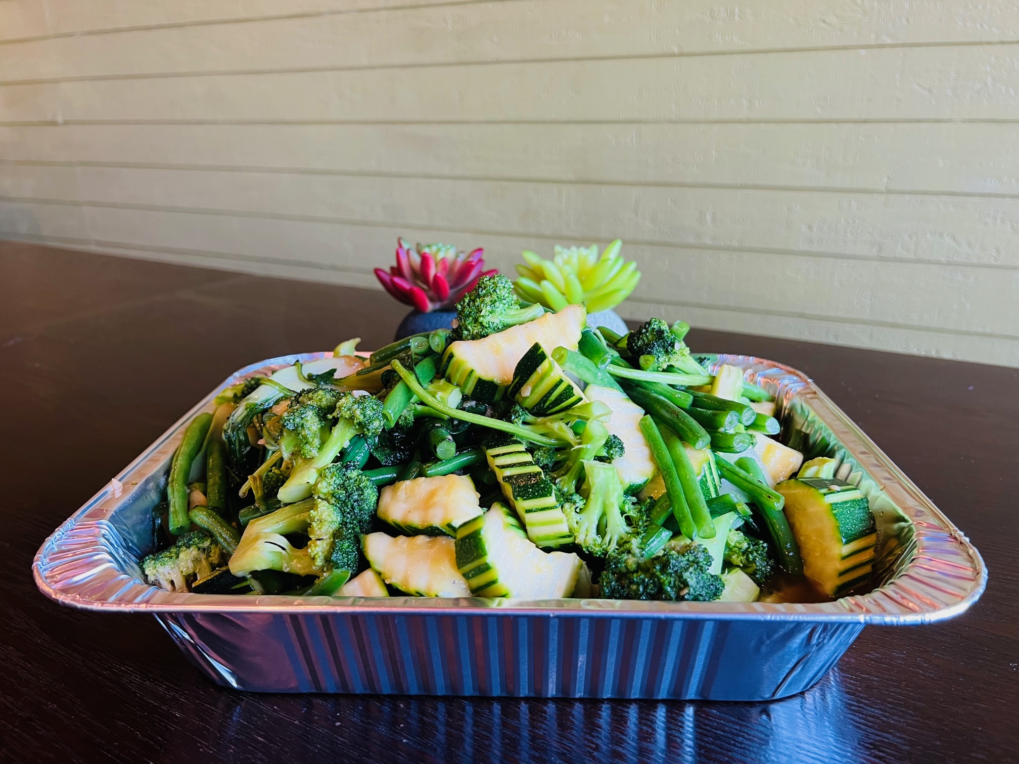 Stir fried with broccoli, zucchini, spinach, bok choy and green beans