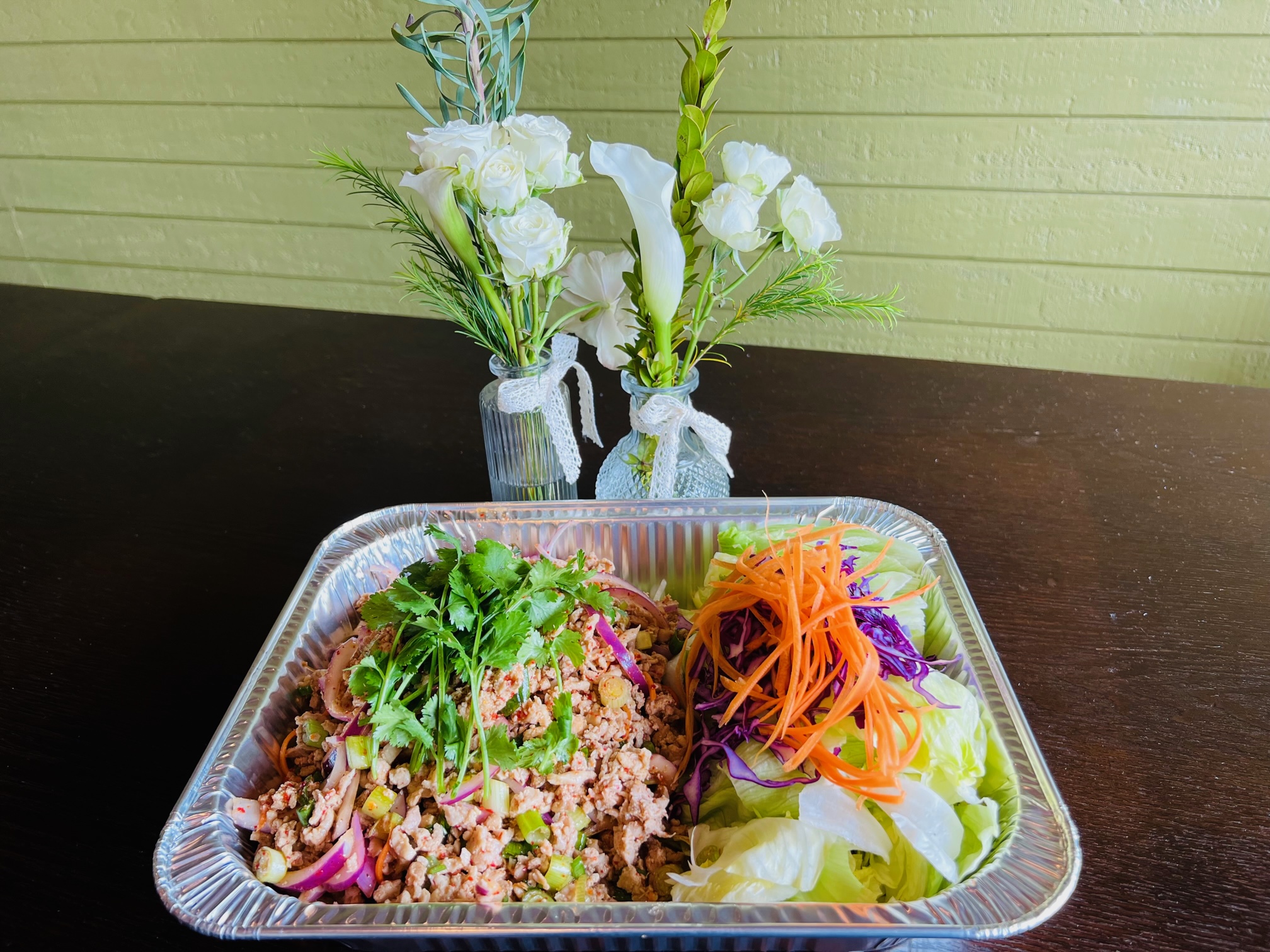 Ground chicken with cilantro, green onions, carrots, red onions, and roasted rice powder