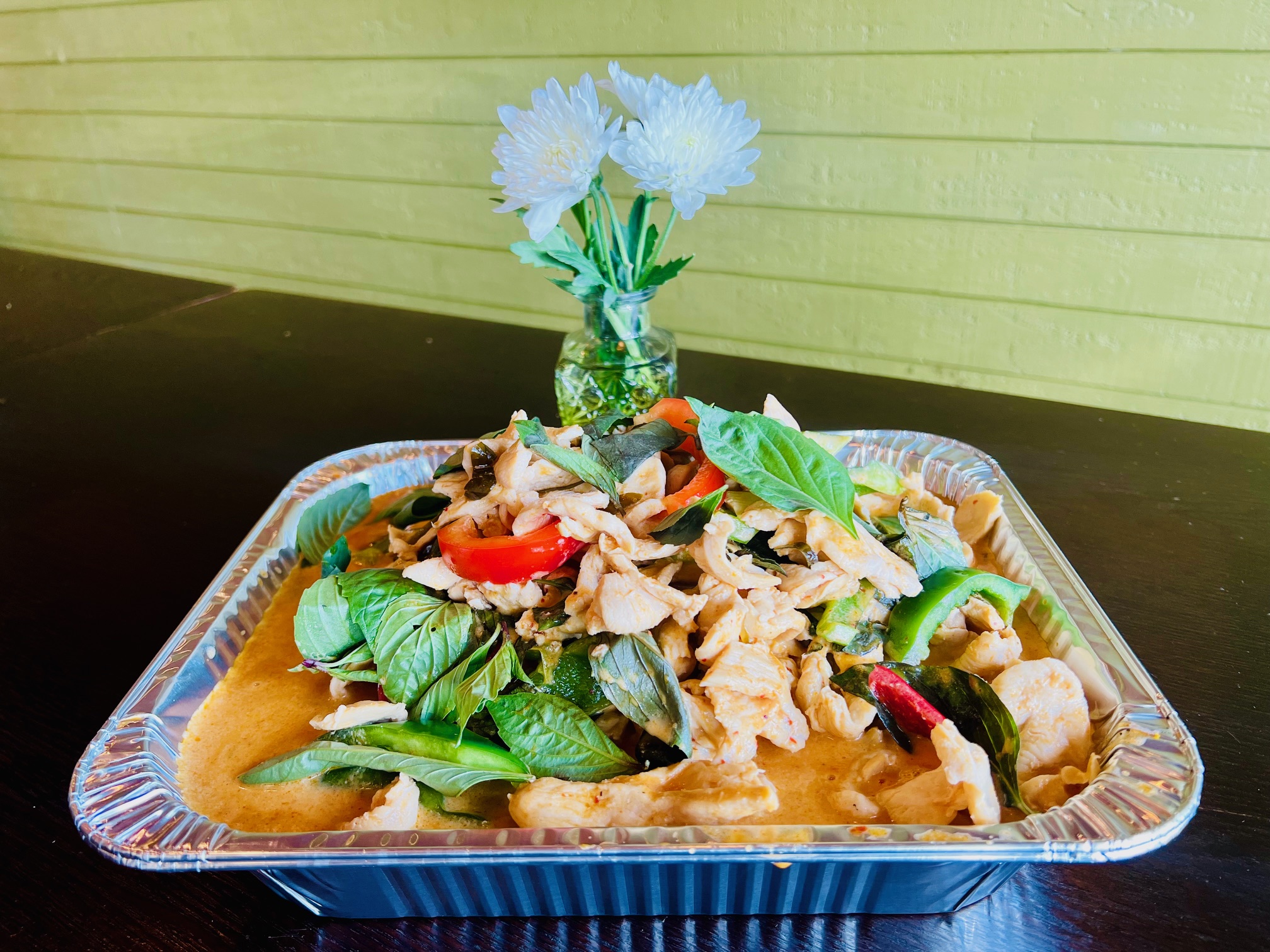 Stir fried with bamboo shoot, onions, green beans, bell peppers, and basil