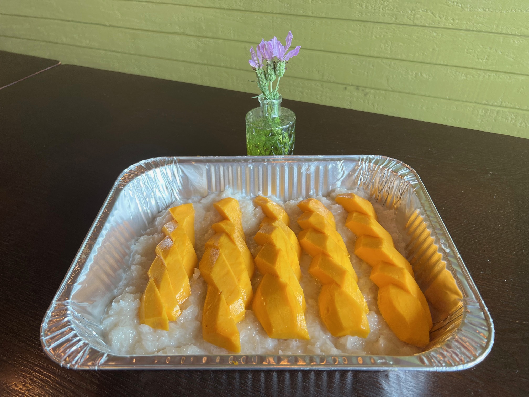Glutinous rice cooked in some coconut milk along with fresh sweet ripe mangoes