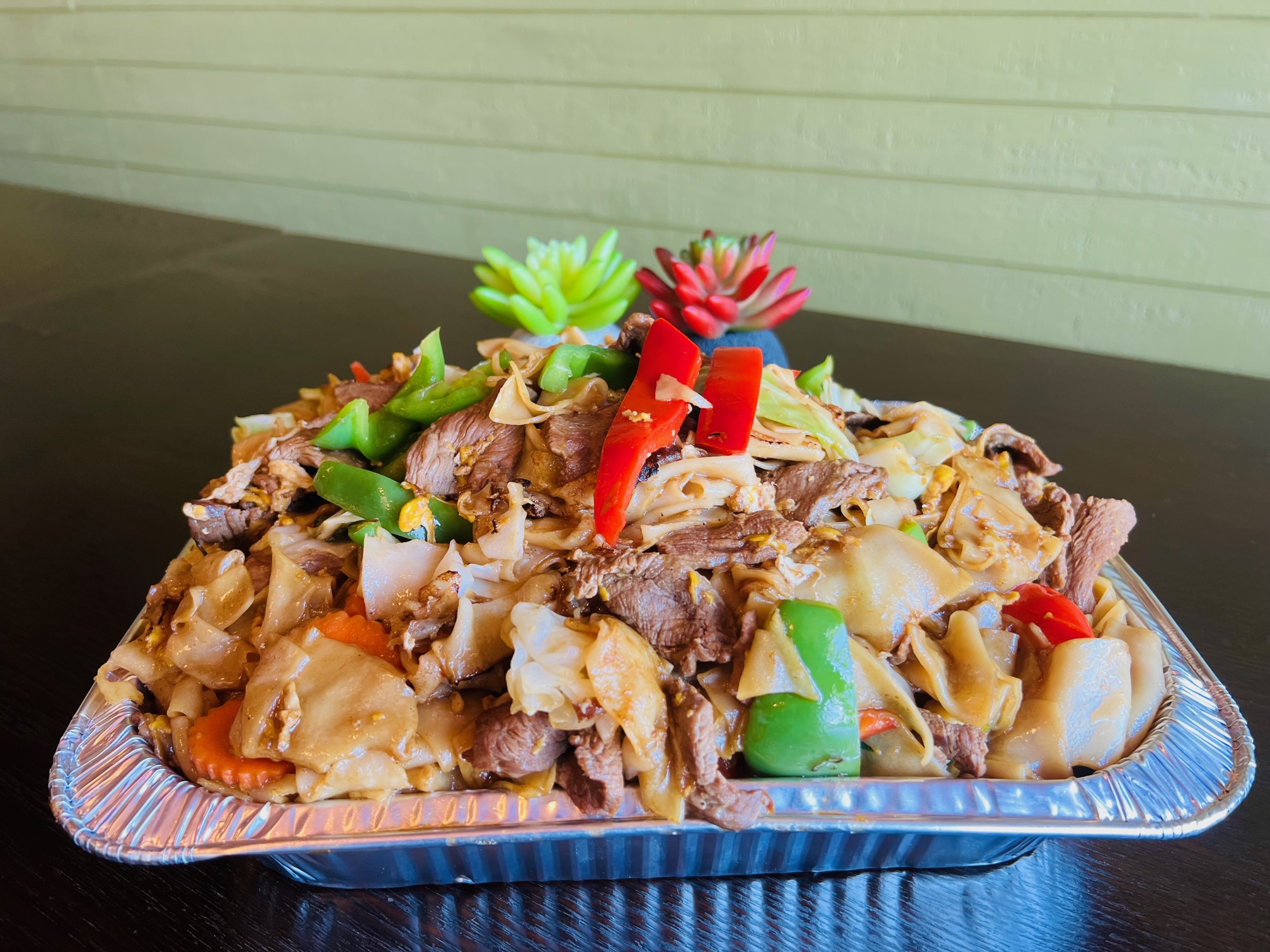 Stir fried wide rice noodles with egg, basil, chili, carrots, bell peppers, and cabbage