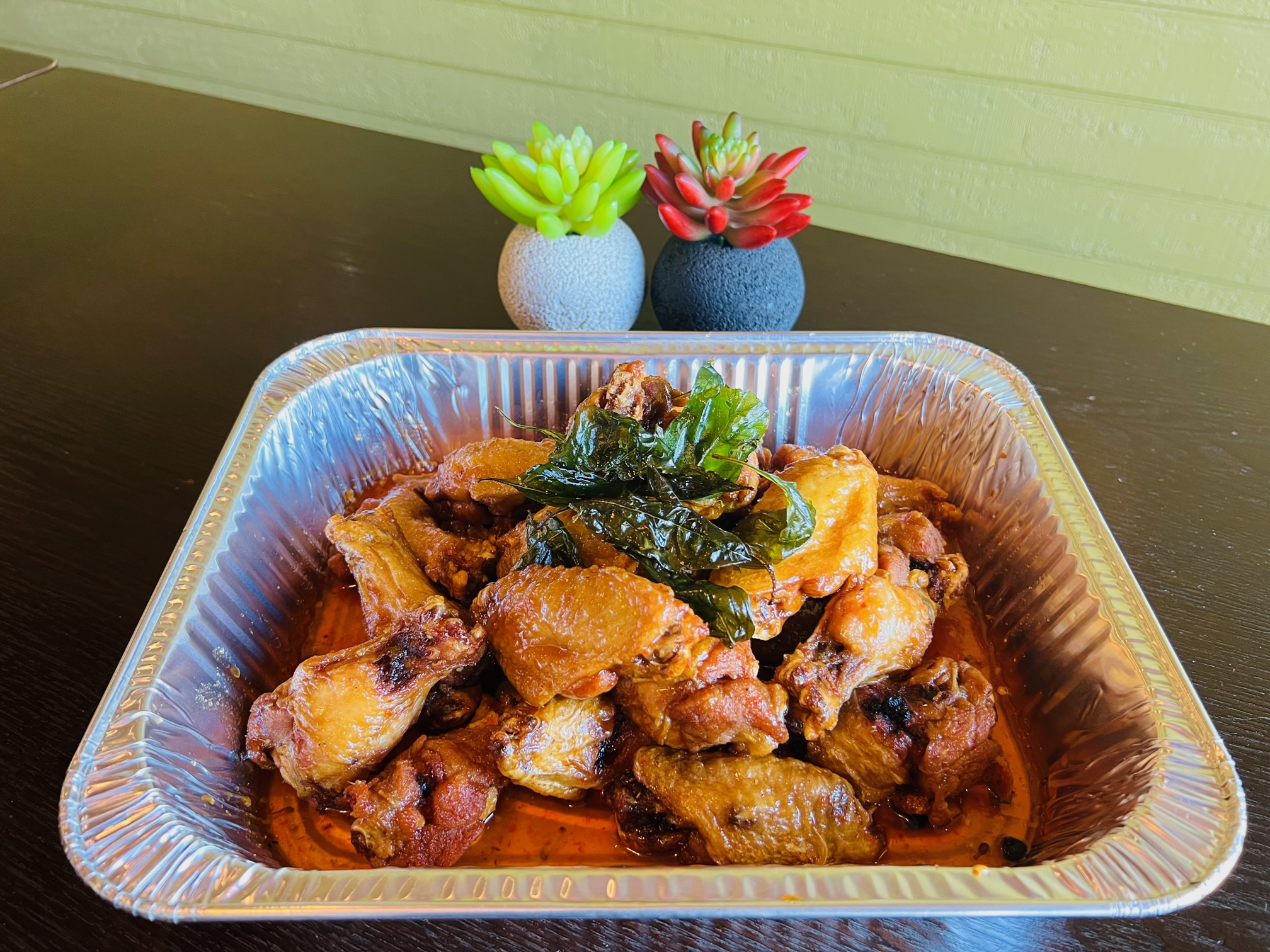 Fried chicken wings and glazed with sweet and tangy sauce with crispy basil