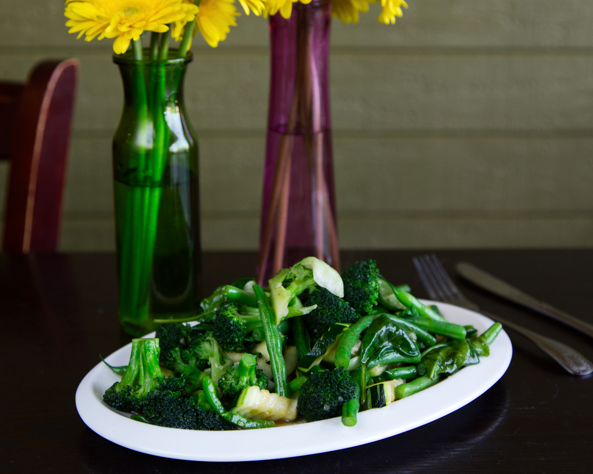Stir fried with broccoli, zucchini, spinach, bok choy and green beans