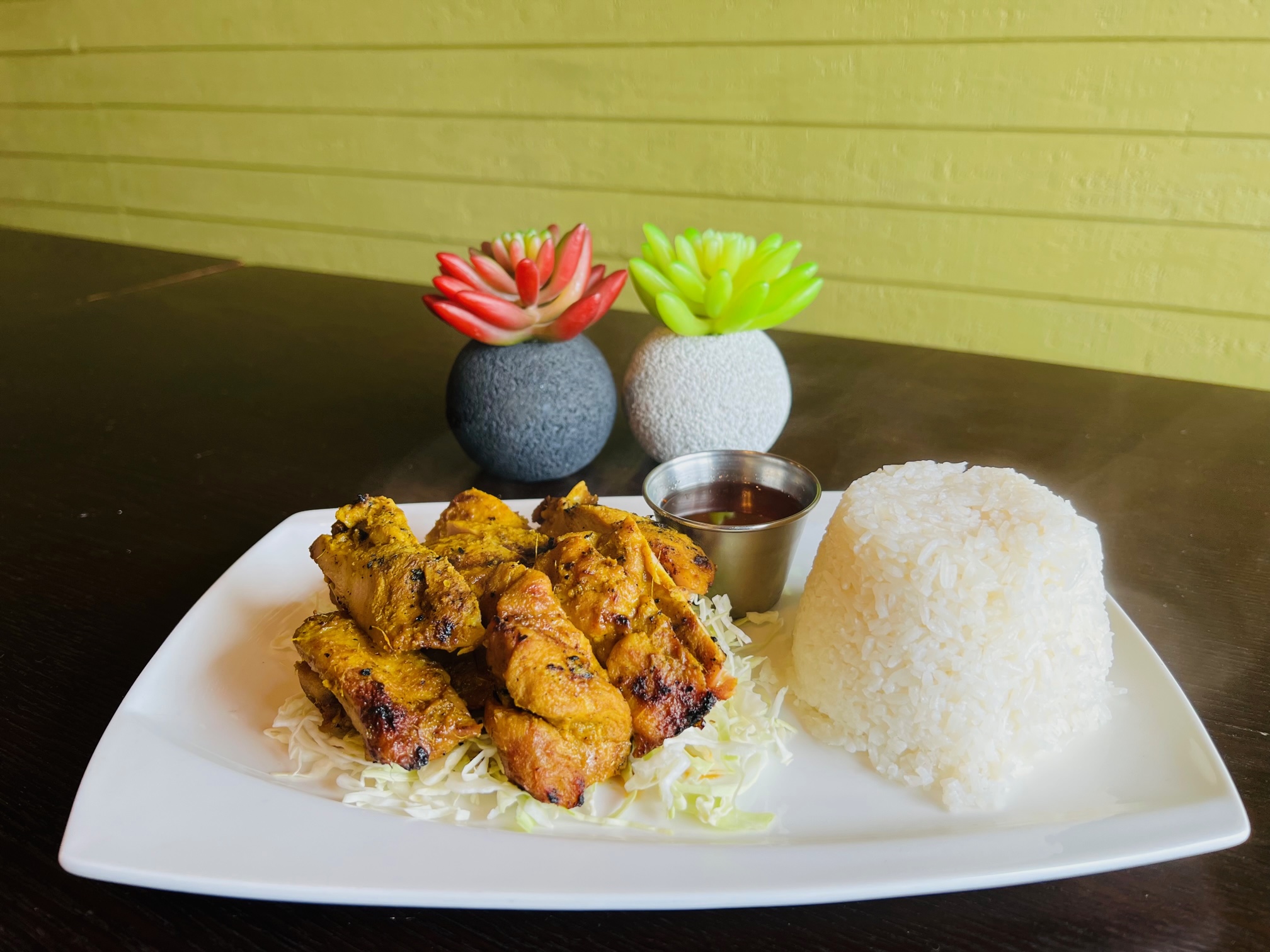 Grill marinated chicken (Thight) with Thai herbs served with sweet and sour sauce