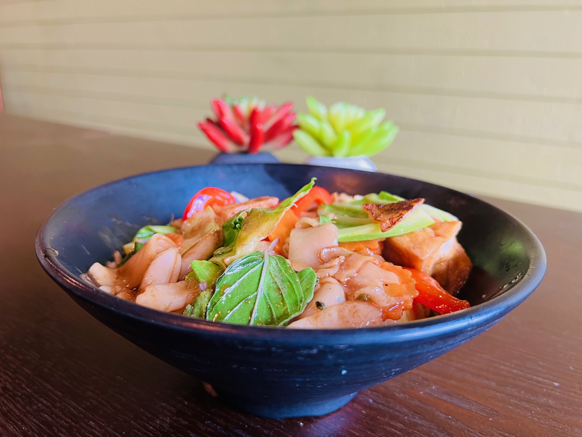 Stir fried wide rice noodles with egg, basil, chili, carrots, bell peppers, and cabbage